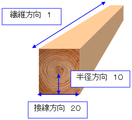 収縮の度合いは、木材の方向によって大きく異なります。木材の長さ方向(繊維方向)の収縮の度合いを1とすると、丸太の表面から芯へ向かう方向(半径方向)の収縮の度合いは10、年輪に沿った方向(接線方向)は20となります。このため、木材の木取りによって、裏表、左右で収縮率が異なり、割れ、曲がり、反りなどが発生します。