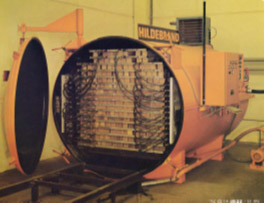 乾燥機内を減圧して沸点を40℃程度まで下げます。アルミの熱板内に80℃の温水を循環させ、直接木材を熱します。木材の温度が60℃程度であっても、真空乾燥機の場合、木材に含まれている水分は沸騰し続けるため、乾燥時間は12時間程度と他の木材乾燥と比較して非常に短くなります。